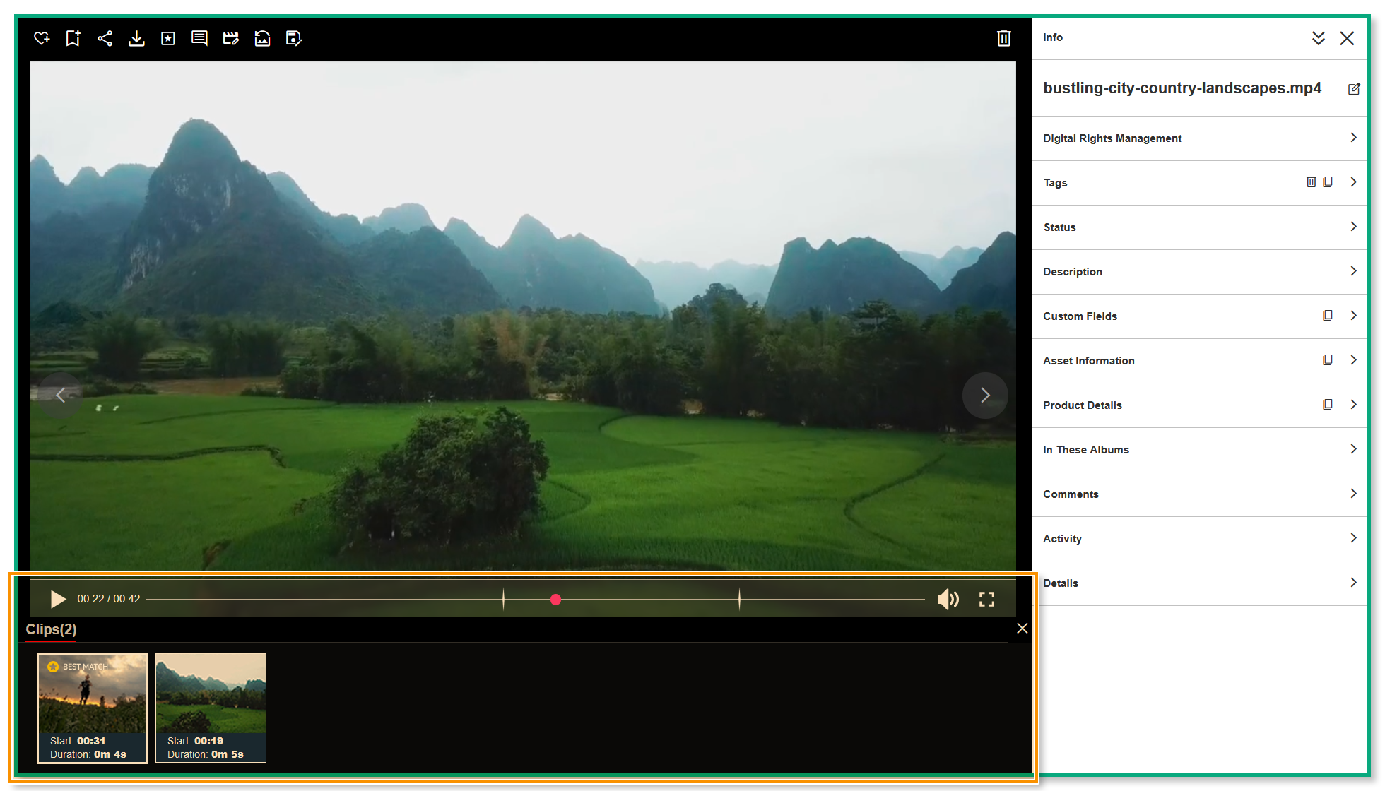 要件に最も適したものを見つけやすくするために、AIビジュアル検索では見つかったクリップを関連性に基づいて整理し、検索内容に最も一致するものを強調表示します。さらに、各クリップの場所がアセットのタイムライン上に示されるようになりました。