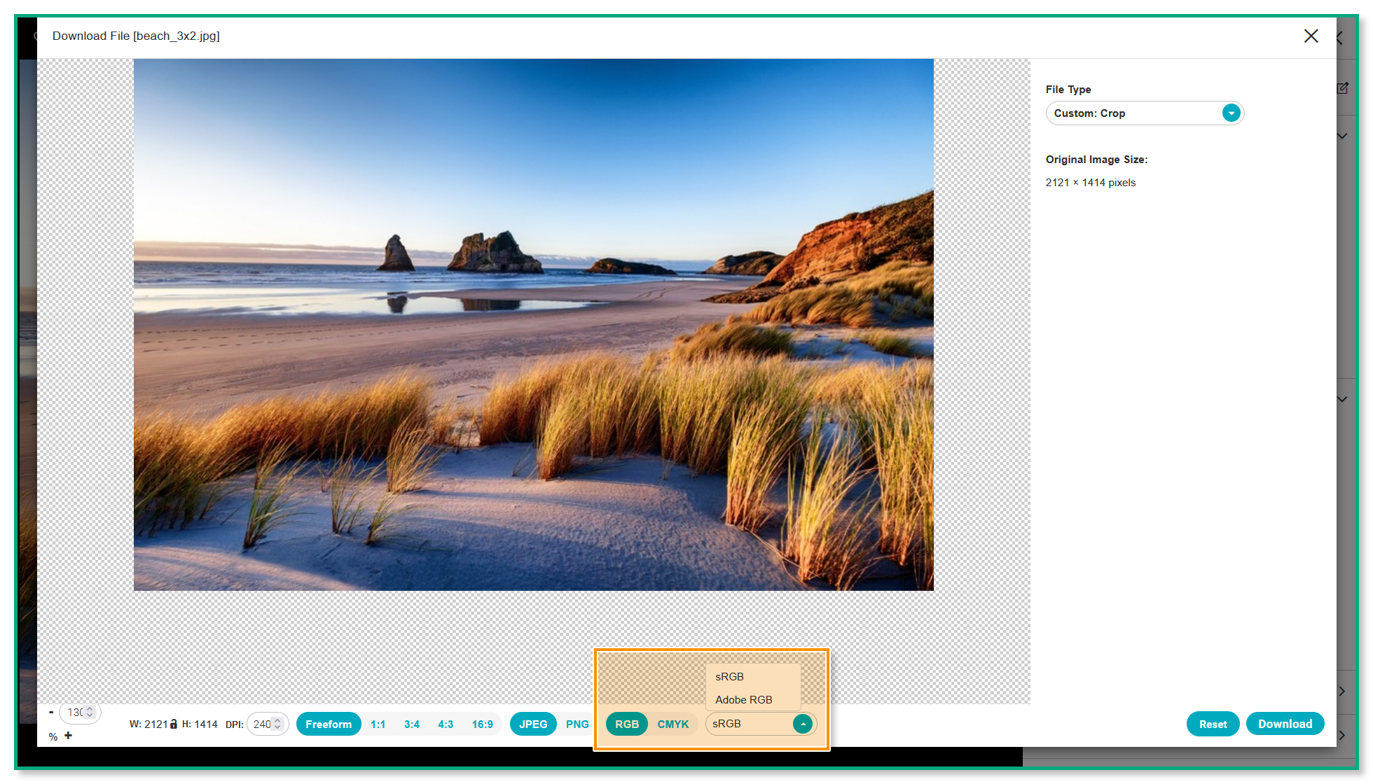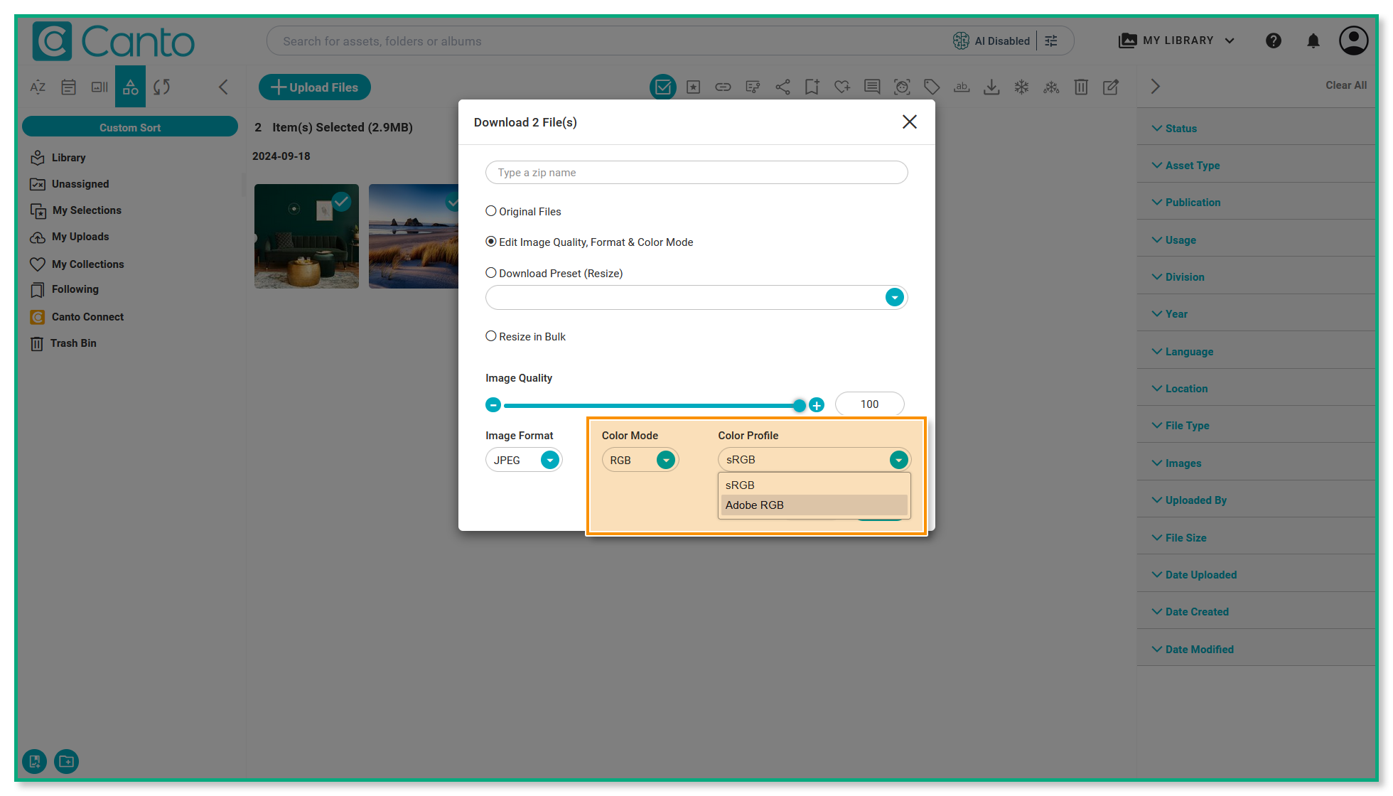 正確で一貫したカラー管理を実現するために、アセットを Adobe RGB カラープロファイルでダウンロードできるようになりました。このオプションは、すべてのカスタムモードとダウンロードプリセットで使用でき、個々のアセットと一括ダウンロードに適用できます。