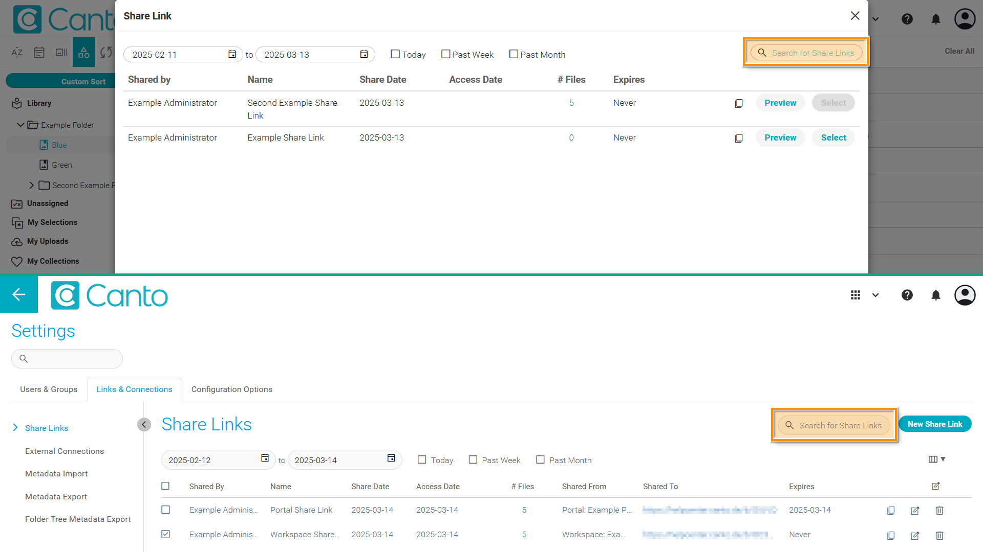 ライブラリからアセットを共有するとき、または、古い共有リンクを更新するとき、検索フィールドに名前を入力して目的の共有リンクを検索できます。