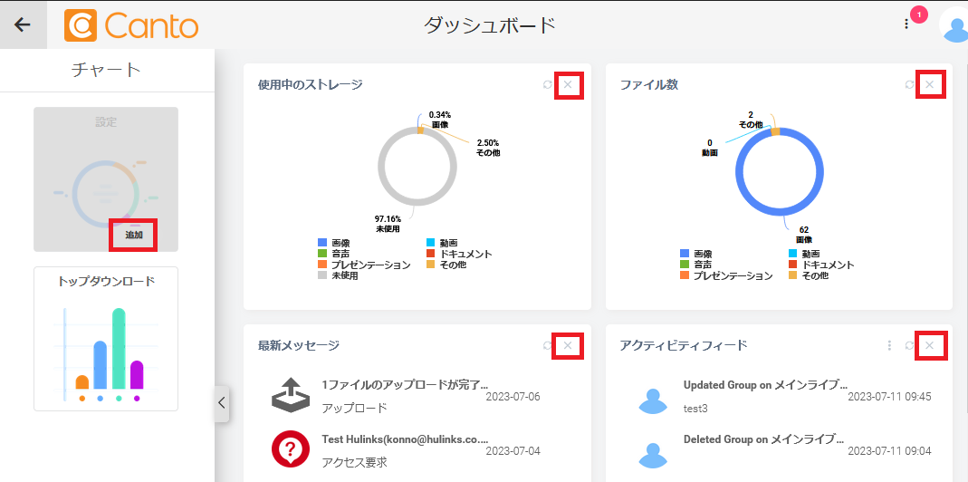 - x アイコンをクリックすると、レポートを非表示にすることができます。非表示のレポートは、ページ左側のチャート欄にサムネイルとして表示されます。サムネイルの上にマウスを移動し、「追加」ボタンをクリックすると、対応するレポートが表示されます。
