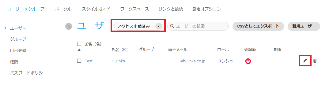 - 「ユーザー&グループ」>「ユーザー」が表示されます。アクセス要求のカテゴリに該当するエントリのみが表示されます。