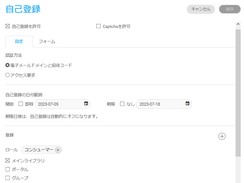 自己登録を有効にすると、新規ユーザーがメインライブラリまたはポータルに自分で登録できるようになります。