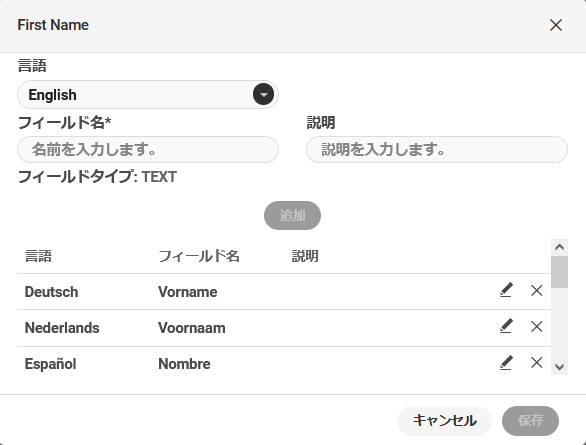 - フィールド名(およびオプションで説明)を選択した言語で入力します。