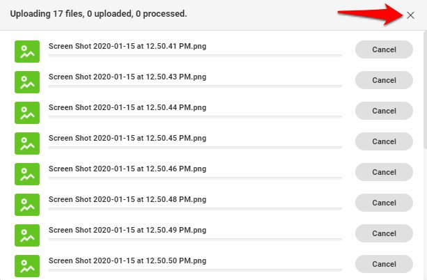 間違ったファイルをアップロードしていることに気づいたら、すぐにすべてのアップロードをキャンセルすることができます。