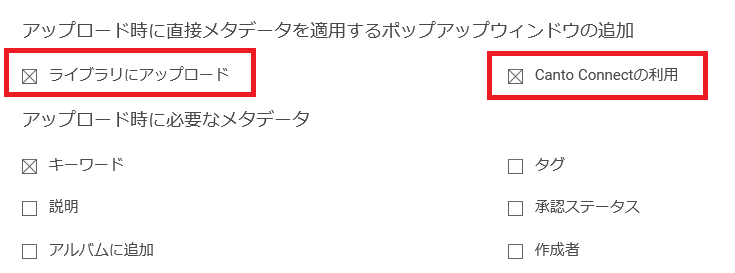 「設定 > 設定オプション > アップロードの設定」で、上記の方法でライブラリにファイルをアップロードする際にポップアップウィンドウを表示させるか、Canto Connect を使用する際に表示させるかを決めることができます。