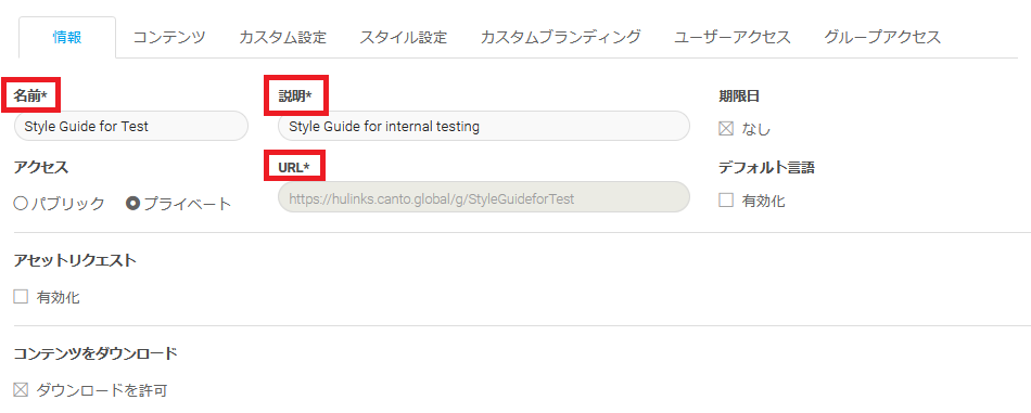 - 「情報」タブでは、スタイルガイドのアクセスタイプやレイアウト設定などの機能をカスタマイズすることができます。下にスクロールすると、詳細情報を追加したり、ダウンロードオプション、スタイルガイドを非公開にするか公開にするかなどの設定をすることができます。