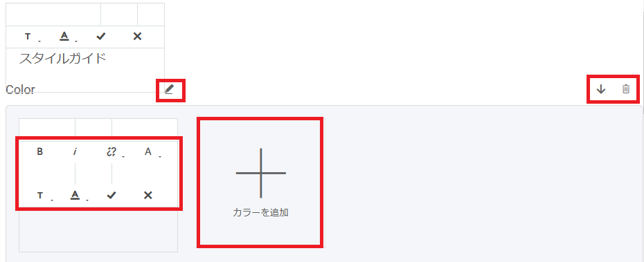 - 「スタイル設定」タブでは、スタイルガイドにコンテンツを追加することができます。「スタイル設定」タブでは、スタイルガイドにコンテンツを追加することができます。デフォルトのセクションは、強調表示されたボタンで調整できます。新しいセクションは、ページ下部の追加ボタンを使って作成できます。矢印を使用して順序を再調整したり、ごみ箱をクリックしてセクションを削除することができます。