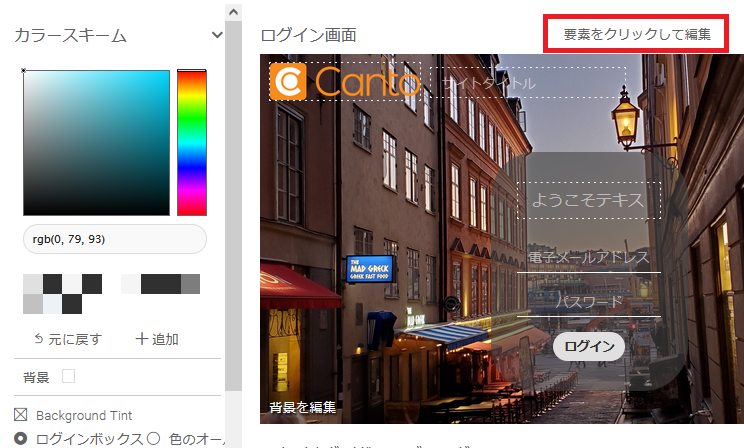 - 「カスタムブランディング」タブでは、スタイルガイドページの背景、ロゴ、色を編集できます。