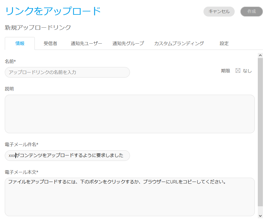 注記:これで、新しいアップロードリンクに必要な情報がすべて入力されます。ここで「作成」(右上)をクリックすると、設定が完了し、指定した受信者にアップロードリンク付きのメールを送信することができます。