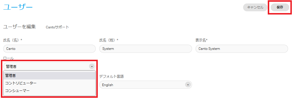 注記:原則として、どのユーザにもデフォルトのロール(管理者、コントリビューター、コンシューマー)またはカスタムのロールを割り当てることができます。ただし、利用可能な読み書きのライセンス数は、アカウントのプランで指定されています。ライセンスを追加するには、Canto のアカウント・マネージャーにご連絡ください。