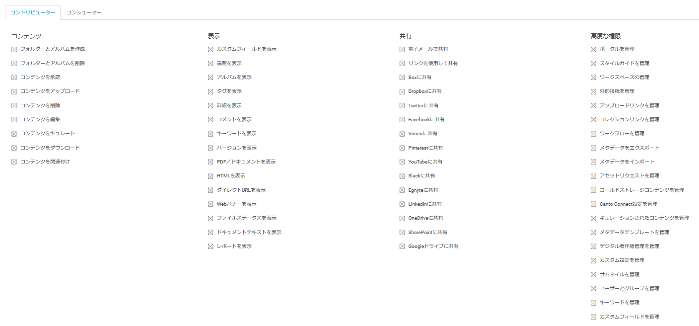 コントリビューターの権限は、管理者による設定で編集することができます(設定 > ユーザー&グループ > 権限)。
