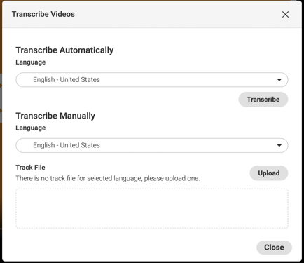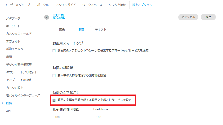 アカウントマネージャーによって機能が有効になったら、「Transcription for Videos」をスクロールダウンして、機能をオンにします。この機能を有効にすると、動画の書き起こしに何時間使われたかをモニターすることができます。