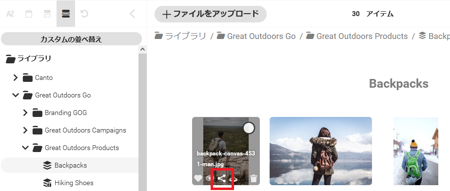 キュレーション表示のアルバムは、アルバムが保存されているフォルダに戻り、アルバムにカーソルを合わせて、共有アイコンをクリックすることで共有できます。