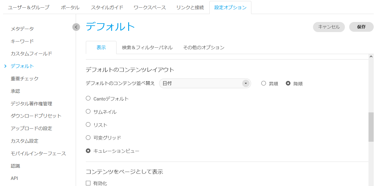 ポータルのデフォルト表示を調整するには、「情報」タブ > 「デフォルトコンテンツレイアウト」の「キュレーションビュー」をチェックする必要があります。