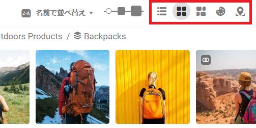 Canto のアセット表示には、5つの表示オプションがあります(左から右):