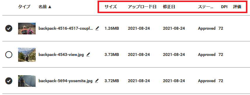 アセットはリストとして表示され、アセットの横にあるメタデータを確認することができます。