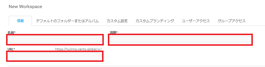 - 「情報」タブで、新しいワークスペースの名前、説明、カスタム URL を入力します。
