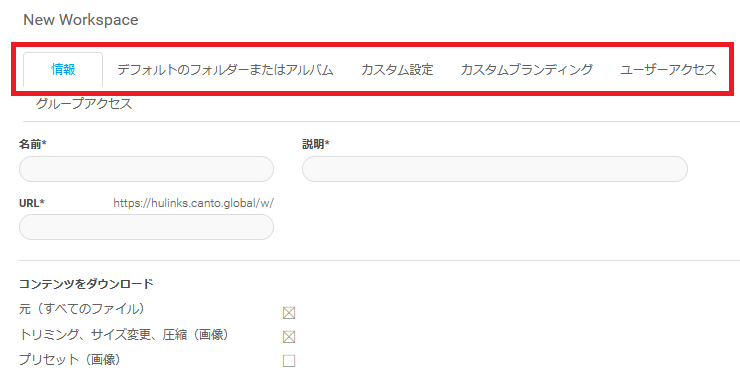 - タブをクリックして、ワークスペースのさまざまなプロパティを編集します。