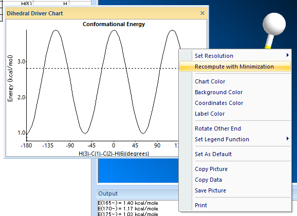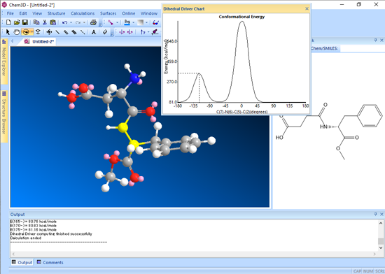 二面角ドライバー (Dihedral Driver) を使用することで、最大で2つの二面角の角度を変えることができ、モデルの配座エネルギーを計算できます。