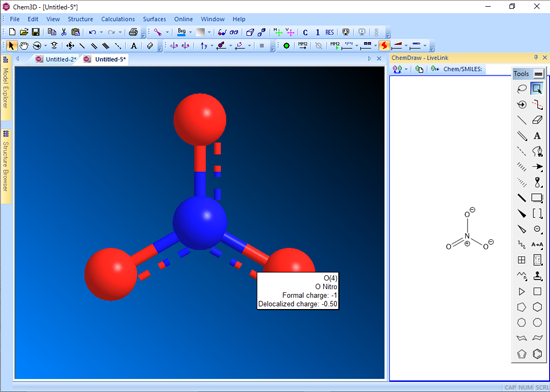 Chem3D では原子に形式電荷 (Formal Charges) を割り当てることによって、モデル内の非局在化が生じている全ての原子に対して、非局在化電荷 (Delocalized Charge) を計算します。