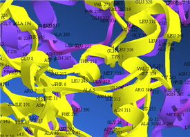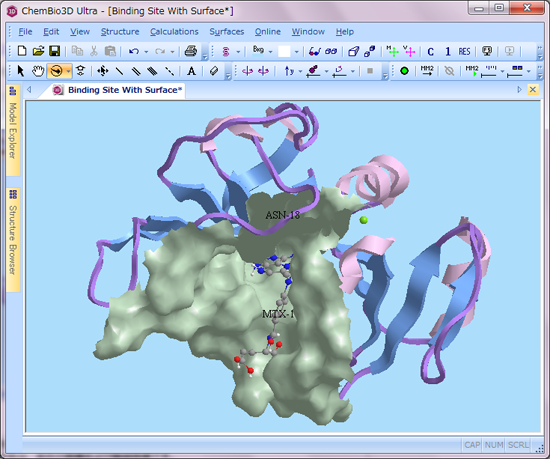 配位子を除いたタンパク質の分子表面や、タンパク質の活性部位を示す表面を作成することができます。作成した表面は、透明度や反射率、色等も設定することが可能です。