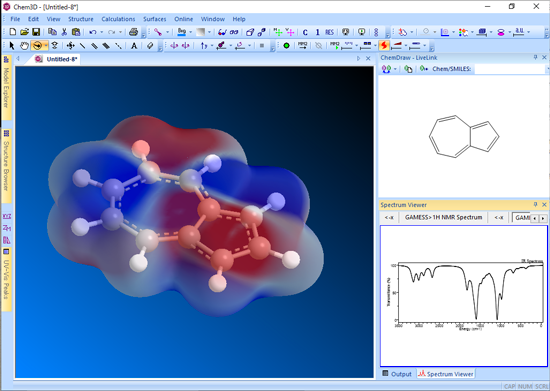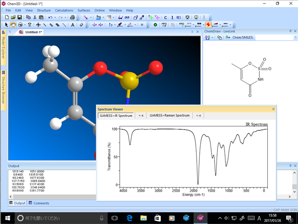 また、Chem3D Ultra に限りますが、MOPAC、GAMESS、Gaussian などのインターフェースを使用することで、ab initio計算や、半経験的計算、NMRの予測/可視化、IR/Ramanスペクトルの可視化なども実行が可能です。