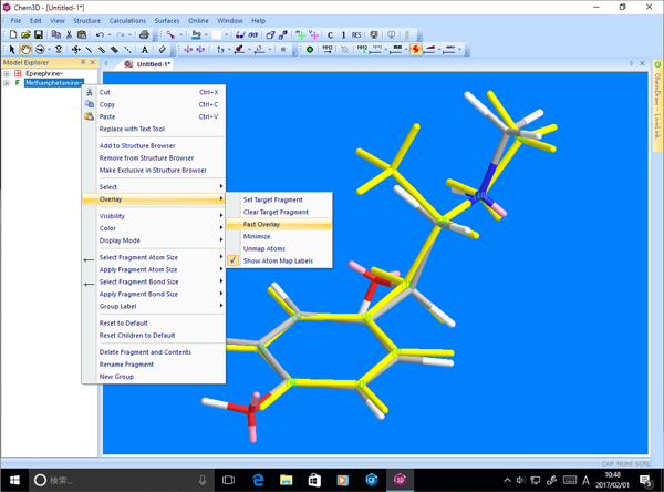 Chem3D には2種類のオーバーレイ手法が用意されています。高速オーバーレイでは、2つの分子モデルから、いずれか一方をターゲット分子として指定することで、Chem3D が自動的に2つのモデルを重ね合わせます。