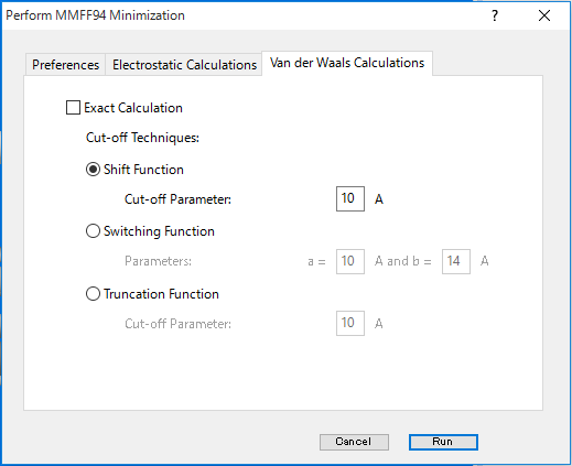 MMFF94 を使用して、分子モデルのポテンシャルエネルギーを計算できます。非結合エネルギーは、静電相互作用とファンデルワールス相互作用のエネルギーの総和になります。