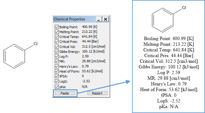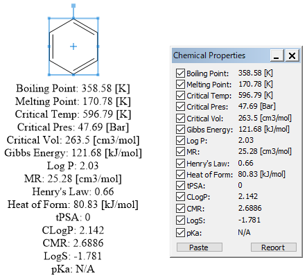 Boiling Point から始まり、LogP や tPSA、pKa といったさまざまな化学特性を表示することが可能で、その情報をドキュメントに貼り付けることもできます。