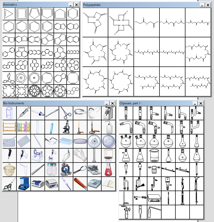 ChemDraw には、あらかじめ描画された化学構造式や実験器具画像のテンプレートが豊富に用意されています。