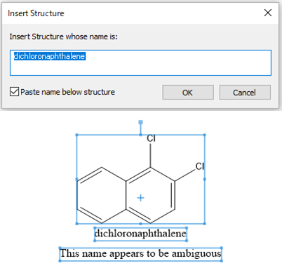 ChemDraw には、化学構造式と化学名を生成するための2つの機能 (Name > Struct、Struct > Name) が用意されています。これは化学名から構造式への変換、また化学構造式から化学名への変換を行う業界トップレベルの総合的機能で、荷電化合物、塩基などの多くの化合物、対称性の高い構造式、その他のさまざまな無機物や有機金属に対して使用できます。