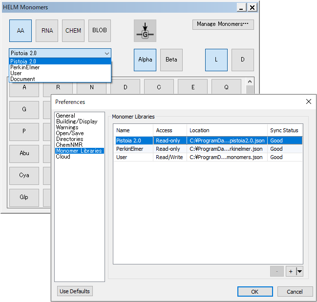 ChemDraw には、生体分子描画やシーケンスの作成を容易に行うためのモノマーインターフェースが用意されています。HELM Monomersツールバーを使用することで、核酸やアミノ酸に割り当てられた定義済みのラベルを用いて素早くシーケンスを描画することができます。