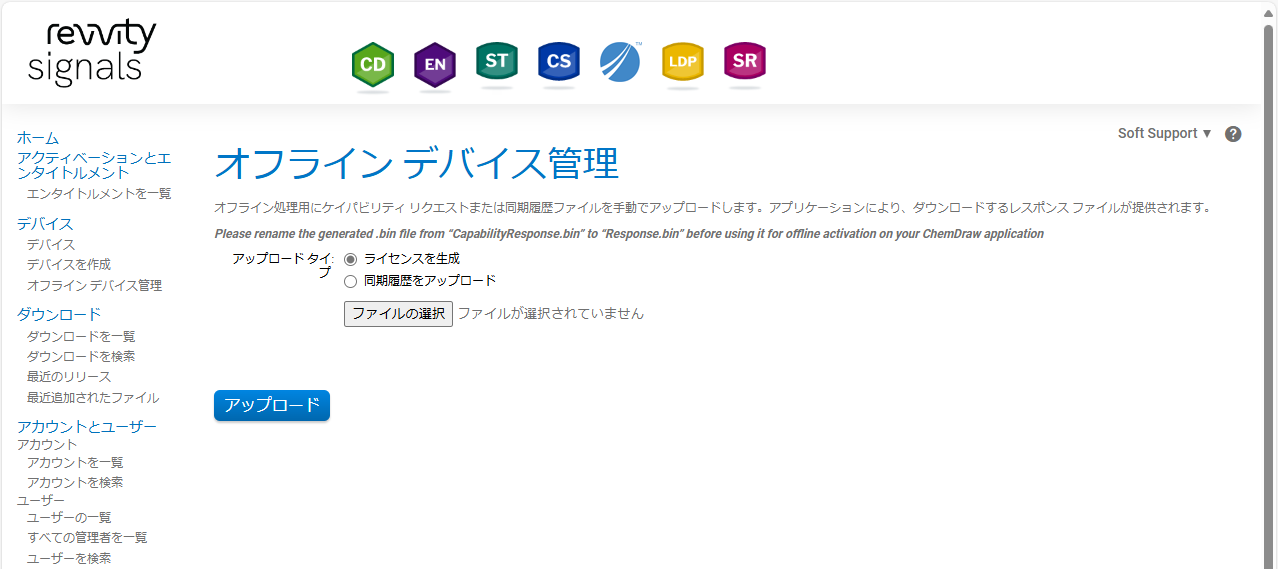 - ライセンスを生成 のラジオボタンを選択し、ファイルの選択 ボタンから保存したDeactCapRequest_xxxxx.bin ファイルを指定した後、アップロード ボタンをクリックします。