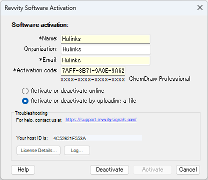 - アクティベーションウィンドウにて、Activate or deactivate by uploading a file を選択して Deactivate ボタンをクリックします。