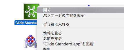 4. CLiDE製品を選択し、副ボタンでコンテクストメニュー から「開く」を選択して起動します。(マウスの場合は右クリック)