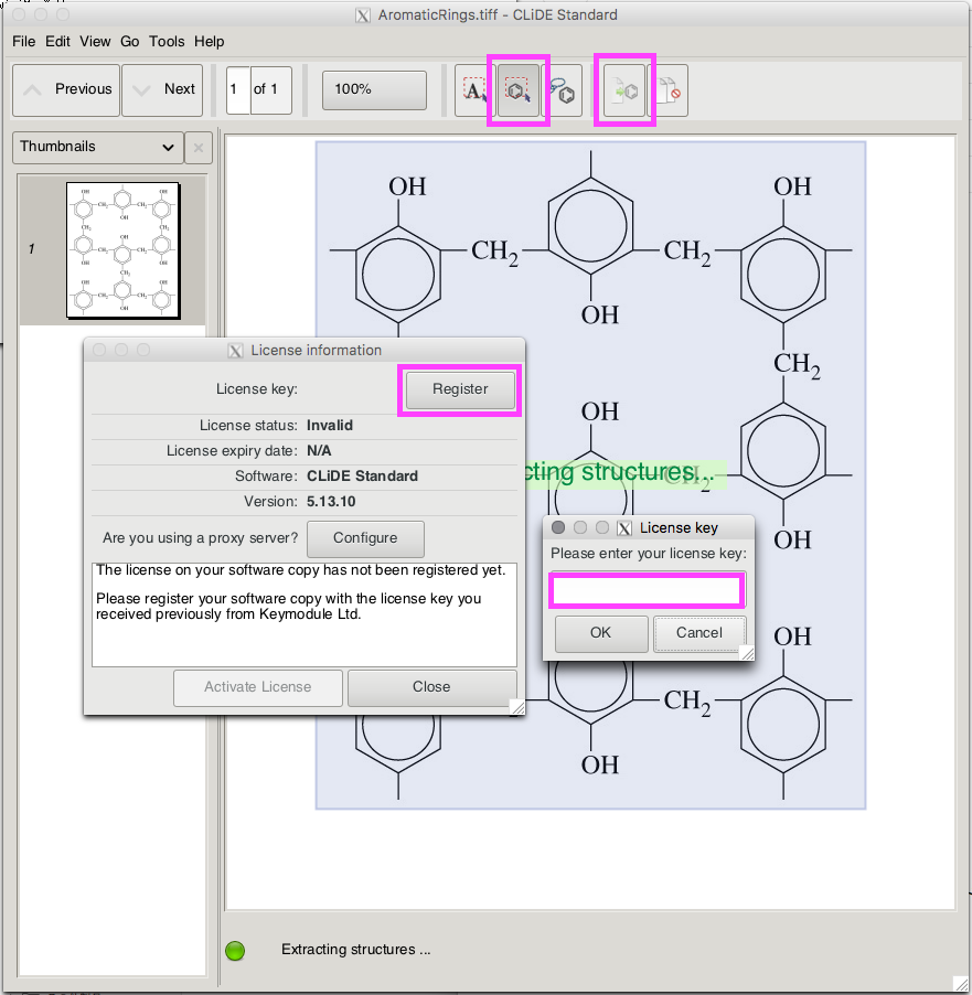 「Select structure」で化学構造式を範囲指定し、「Extract structure from a selection」を選択するとアクティベーションを求められます。