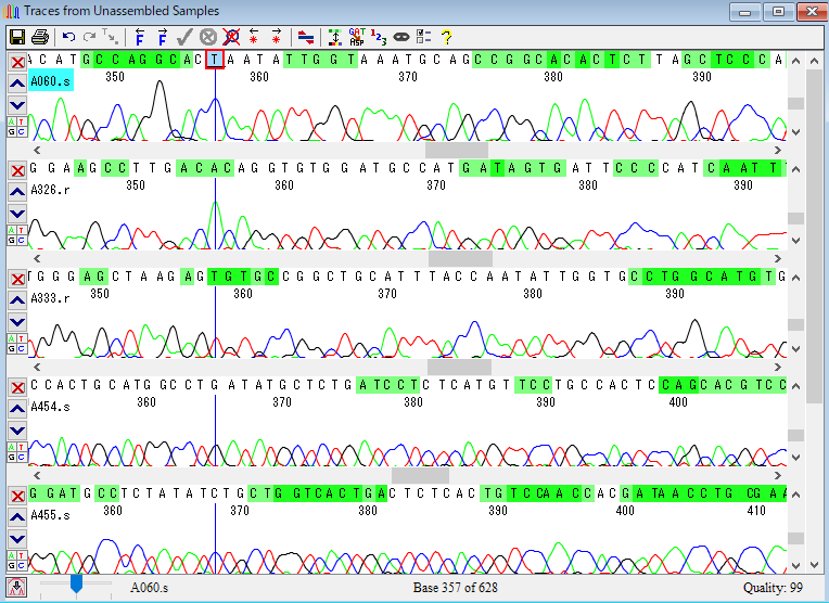 8.トレースを見る:いくつかの配列のクロマトグラムを見てみましょう。図10のウィンドウの「Unassembled Samples」をダブルクリックしてトレースを開きます。トレースの緑でハイライトされている部分は配列のクオリティが低いことを示しています。