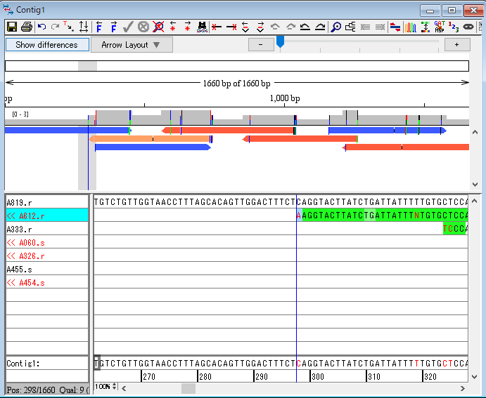 」をクリックして、コンセンサス配列と違う塩基のみを表示させてみましょう。確認したら、もう一度「マスクアイコン」をクリックしてもとに戻します。