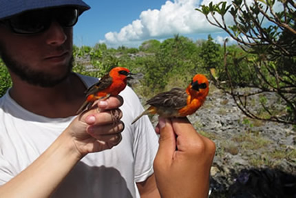 さらに最近は、移入したマダガスカルベニノジコの集団がアルダブラに定着しています。マダガスカルベニノジコは既知の侵入者で、何らかの手段を講じなければ、アルダブラの生態系に深刻な影響を及ぼすと思われます。固有の鳥類への侵略に加えて、新型の病原体の蔓延および生態系プロセスの中断によって、移入ベニノジコが固有種のアルダブラベニノジコと交配し、遺伝子の混合によって固有種の絶滅を引き起こす可能性があります。私たちはすでに、フィールドワーク中に、アルダブラベニノジコなのかマダガスカルベニノジコなのか識別し難い、潜在的交配種を何羽か観察しました。私たちはそれらを捕獲し、交配が発生したのかどうか、どのレベルなのかを評価するため、それらの血液/DNAサンプルを分析しているところです。その結果は、根絶プロジェクト期間中のフィールドワークでの交配種の識別、保全危機の深刻さの評価、根絶プロジェクトへの支援の拡大に役立つはずです。概して、外来種との交配の脅威はあまり理解されていません。このプロジェクトによって、常に評価可能というわけにはいかない、外来種の影響に関する重要なデータが提供されるでしょう。