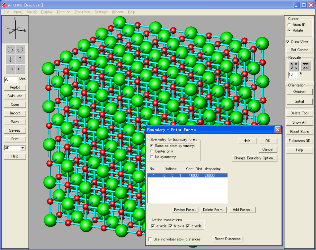 ATOMS は、多くの原子や結晶、高分子を生成するのに、格子並進と空間群対称を使用します。以下の境界オプションが利用できます。
