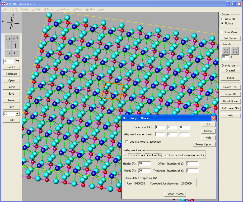 結晶とポリマーの図面の境界は、いくつかの方法で指定できます。第一に、変換反復に制限を設定して、指定数のユニットセルの内容を表示できます。第二に、原点から任意の距離にある結晶の面を境界にできます。第三に、d 間隔に等しい厚さのある指定面に平行な、構造のスライスを表示するオプションがあります。必要であれば、異なる原子について異なる境界レベルを指定できます。第四に、原子または任意の点の周りの球体を表示できます。第五に、すべての分子またはその他の結合されたユニットは全体として識別および表示できます。