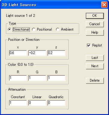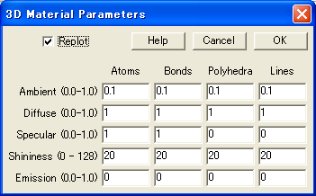 照明の角度に従ったシェーディングは、「Standard (標準)」表示モードでは、原子、結合、および多面体に自動的に適用できます。「3D (三次元)」表示モードは、OpenGL (Windows) または QuickDraw3D (Macintosh) を使用します。「3D (三次元)」表示モードには、ライトニングと材質プロパティに関する追加のオプションがあります。「3D (三次元)」モードは熱楕円をさまざまな方法で表示できます。