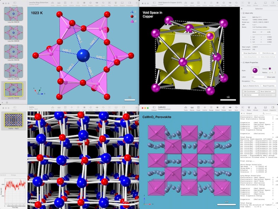 CrystalMaker は、結晶や分子構造を最も効果的に可視化するツールです。インタラクティブに設計されたインターフェースを通じて、周囲との関係を考慮しながら特定の部分を操作したり、複雑な物質構造を理解するためのモデルを構築できます。従来の結晶学ソフトウェアの枠を大きく超えて、可視化した結果を動的に操作したり、回転するアニメーションを作成することができます。エネルギーモデリングツールを使って、構造を新規作成してそのエネルギーを最小化 (relax) したり、振動プロパティを予測したり、他の物質との関係を調べることができます。