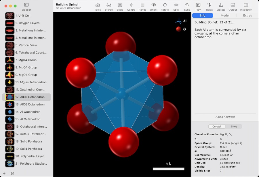 CrystalMaker のドキュメントには、複数の構造を保存することができます。保存された各構造はグラフィカルなサムネイルであらわされます。構造上の挙動やアニメーションとして活用できることはもちろんですが、同じ構造の異なるビュー、異なるモデルタイプ、原子範囲、関連する構造について保存することもできます。どの構造にも個別のノートを付けられます。これらを 3D 回転モデルとともにインタラクティブなスライドショーとして文脈に従って提示することで、教育用として理想的なツールになります。プログラムには、魅力的な教材の作成例が同梱されています (例:”Building Quartz”, “Building Spinel”)。