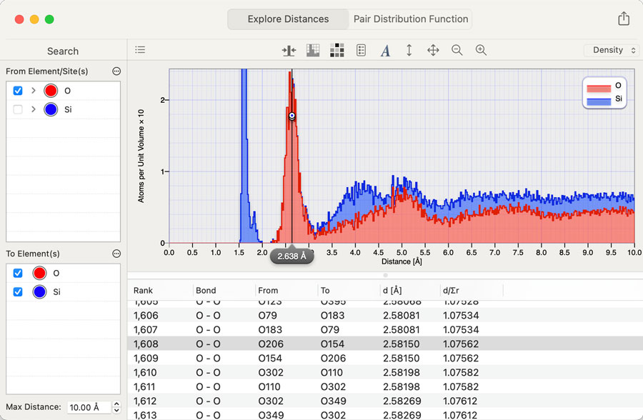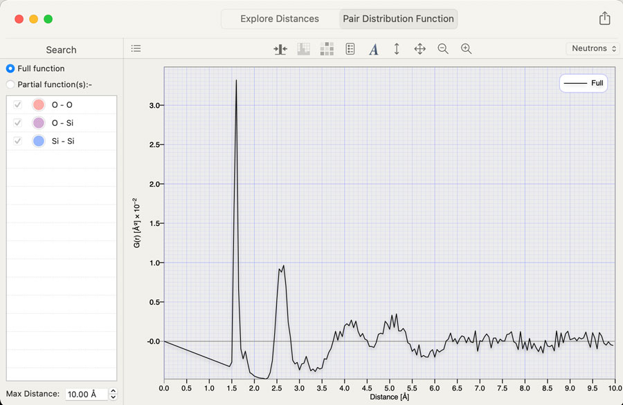 結合距離と角度に関する詳細な情報は、スクリーン上に表示するか、テキストファイルとして出力することができます。パワフルな Distance Explorer を使えば、任意の元素またはサイトの組み合わせについて、その配位環境をグラフィカルに可視化することができます (Video: The Distance Explorer)。 また、x 線と中性子の 2 体分布関数可視化することも可能で、特定の元素対のための「部分」2 体分布関数 (“partial” Pair Distribution Functions) をオプションで選択できます (Video: Pair Distribution Functions)。
