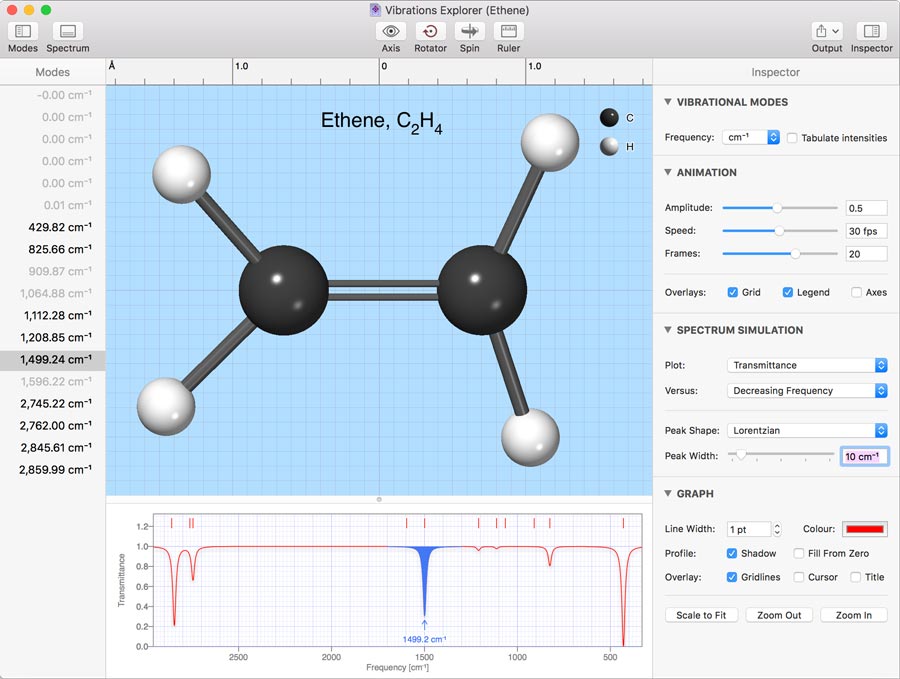 CrystalMaker では、エネルギーモデリングの一部として、作成した結晶の状態密度 (density of states) を計算できます。計算結果は、各振動周波数の相対分布をあらわすヒストグラムとして可視化できます。基礎をなす計算は、物性や熱力学的特性予測の裏付けにもなります。
