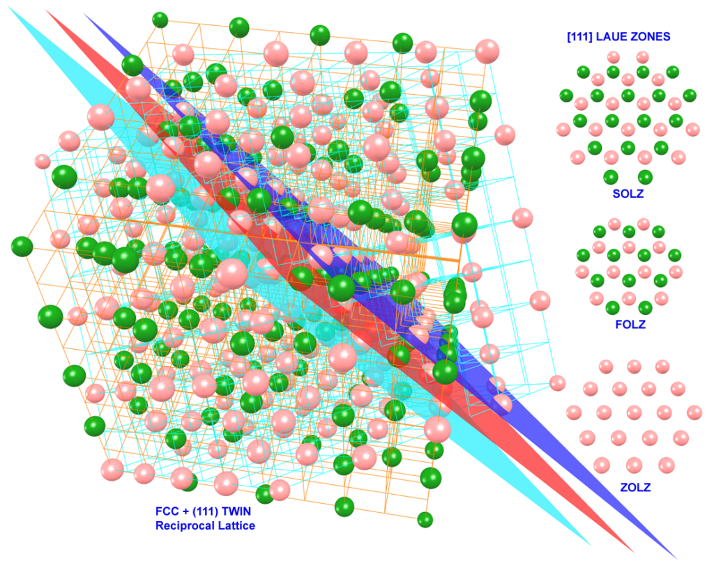 逆格子ビューで 3D ラウエゾーンビューを作成できます。 また、指定されたゾーン軸とラウエゾーンに沿って逆格子を切断することもできます。