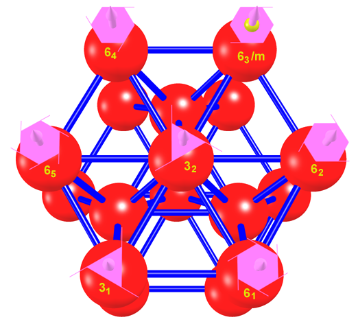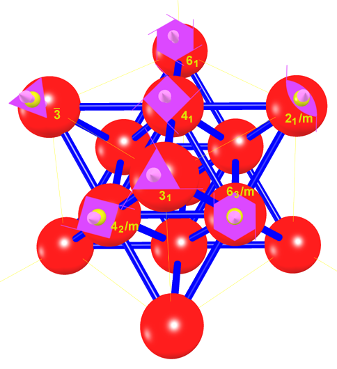 回転軸、らせん軸、対称中心などの対称要素を原子ベクトル上の 3D マーカーで示すことができます。