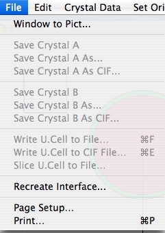 通常の Macintosh アプリケーションと異なり、CrystalKitX のメニューコマンドには Open… コマンドがありません。CrystalKitX の File メニューは、作成済みの CrystalKitX のファイルを開くためではなく、作成した構造や画像を保存するためにあります。以下に、CrystalKitX のコマンドの機能を説明します。