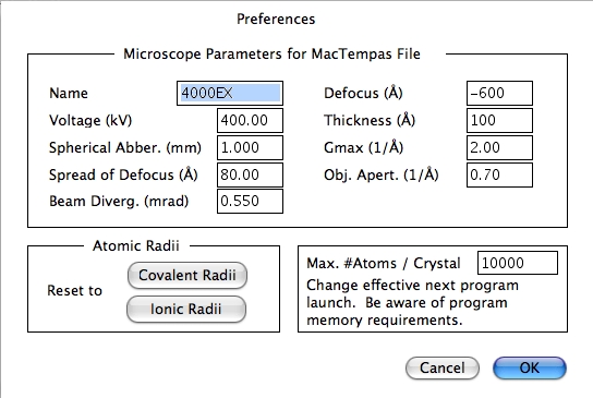 CrystalKitX の各種設定が行えます。その中には電子顕微鏡で使用する値や、MacTempasX がシミュレーションを行うときの層厚などがあります。